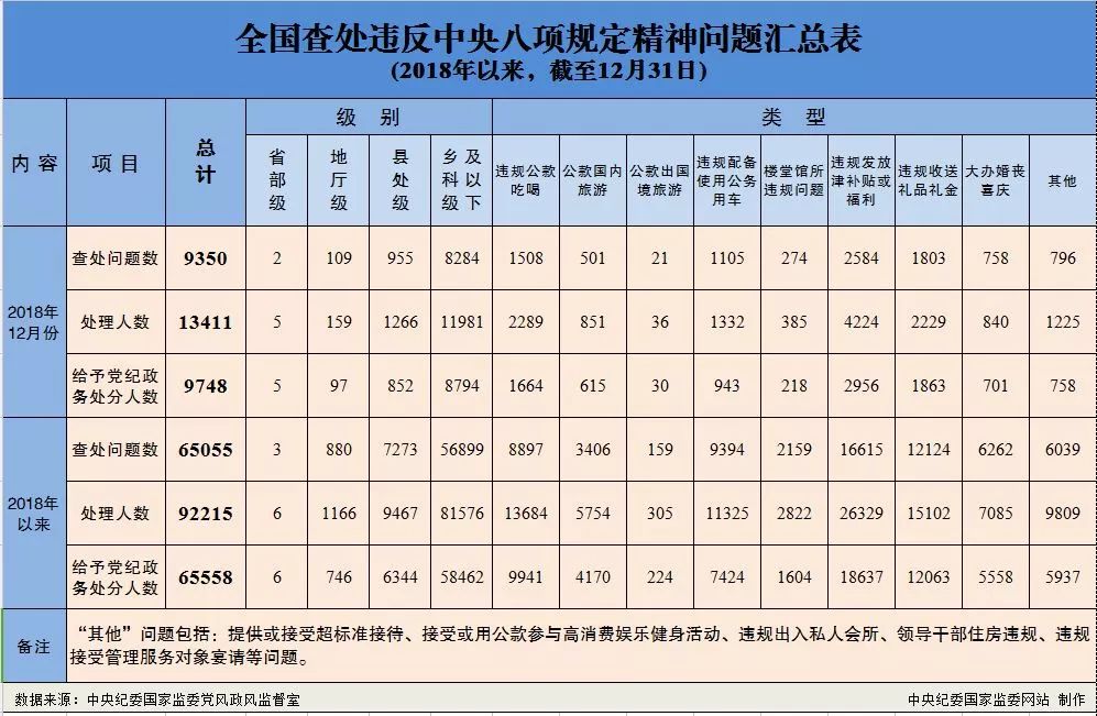 ??????為掌握全國(guó)貫徹落實(shí)中央八項(xiàng)規(guī)定精神情況,中央紀(jì)委在各省區(qū)市和新疆生產(chǎn)建設(shè)兵團(tuán)、各中央和國(guó)家機(jī)關(guān)、各中央企業(yè)和中央金融企業(yè)等建立了落實(shí)中央八項(xiàng)規(guī)定精神情況月報(bào)制度.2018年以來(lái),截至12月31日,全國(guó)查處違反中央八項(xiàng)規(guī)定精神問(wèn)題情況如下: